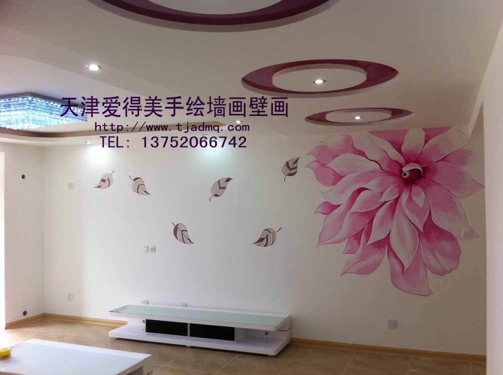 爱得美天津手绘墙画有限公司为天津红桥区万通上游国际画的天津墙绘!客户家影视墙需要做花卉类彩绘墙画素材的墙体彩绘,为其设计了一款大花的造型,手绘墙风格属于比较艳丽的感觉,适合于婚房的气氛,手绘墙画师绘制了很长时间,一朵大花加上挥洒飘落的叶子,相得益彰,浑然一体,使整个房间有了生气,亮了起来,终于完成,下面是画后效果,很唯美。